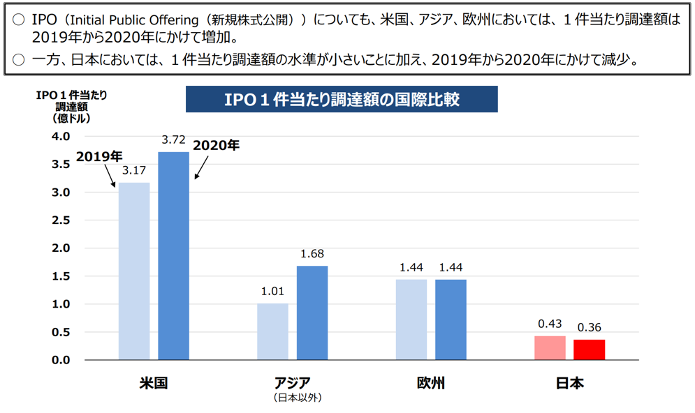 上図のように、IPO調達額の国際比較では、日本はアメリカの10分の1にも満たない金額です。また日本以外のアジアや欧州と比べても日本の調達額は少ない状況です。