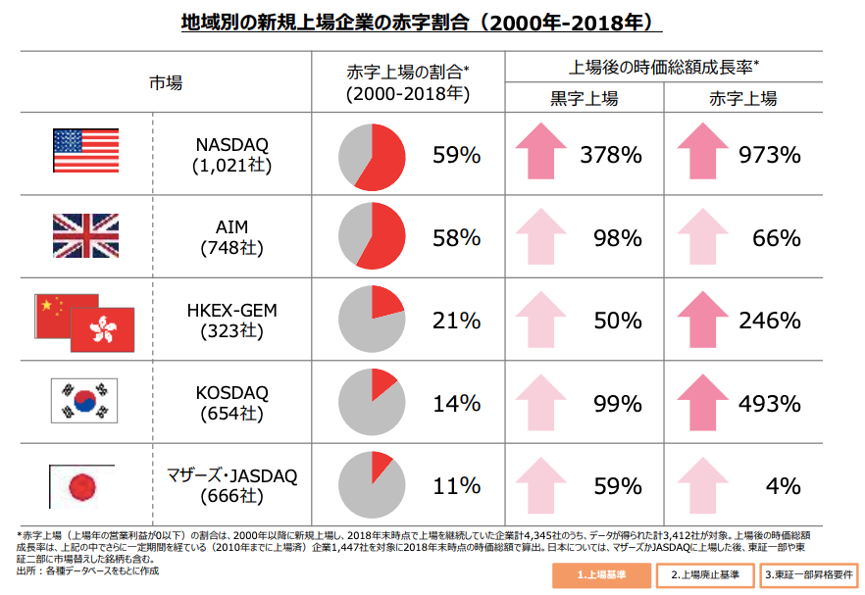 また将来的なポテンシャルが高ければ、先行投資により大幅な赤字を計上する企業でも問題ありません。以下は市場別の赤字上場の割合になります。